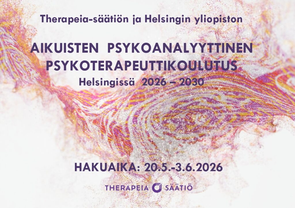 Hakuaika Therapeia-säätiön ja Helsingin yliopiston AIKUISTEN PSYKOANALYYTTISEEN PSYKOTERAPEUTTIKOULUTUKSEEN alkaa Julkaistu: 13.01.2026 Hakuaika Therapeia-säätiön ja Helsingin yliopiston AIKUISTEN PSYKOANALYYTTISEEN PSYKOTERAPEUTTIKOULUTUKSEEN alkaa 14.1.2026 ja päättyy 3.2.2026